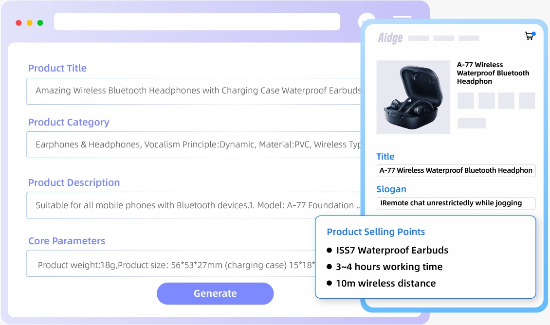 Nell’elettronica di consumo, i titoli dei prodotti influiscono in modo significativo sui clic. Aidge aiuta in maniera formidabile nella generazione di titoli efficaci, aiutando a creare strategie di denominazione che si traducono in click-rate di livelli assoluti.