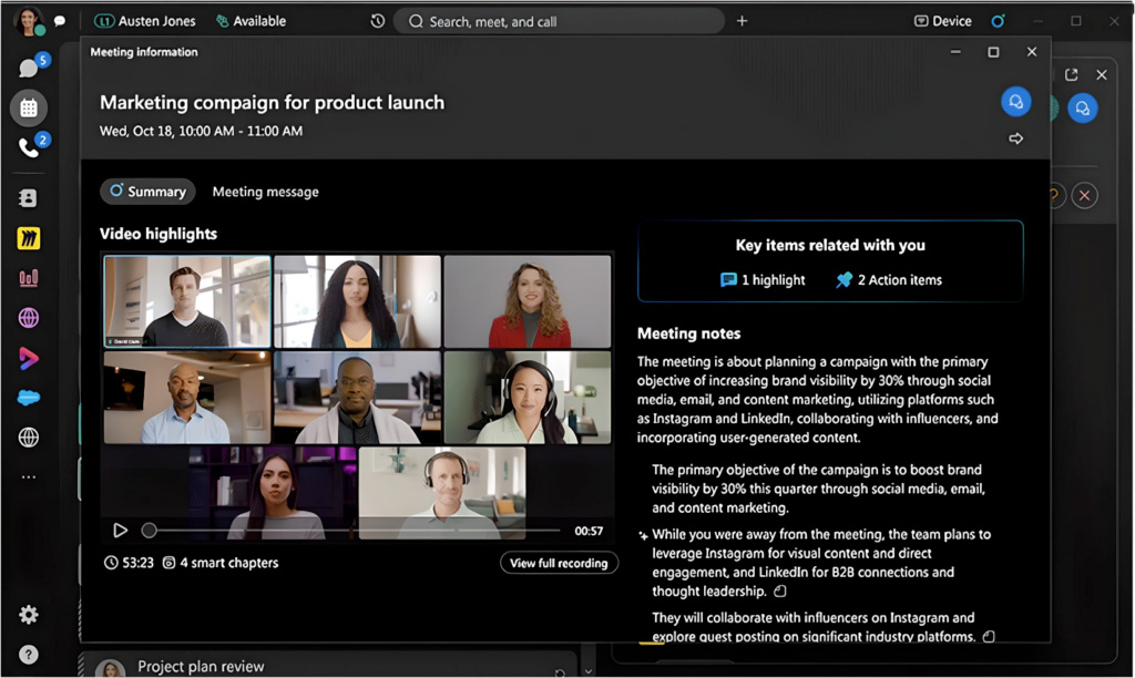 - La funzionalità Meeting Summaries permette di recuperare in tempo reale parti o intere riunioni perse, con un resoconto facilmente fruibile. I resoconti delle riunioni saranno organizzati in capitoli e punti salienti. Grazie ai capitoli, è possibile passare da un argomento all’altro, ad esempio da una parte scritta della discussione a un breve video che riassume il contenuto di una riunione.