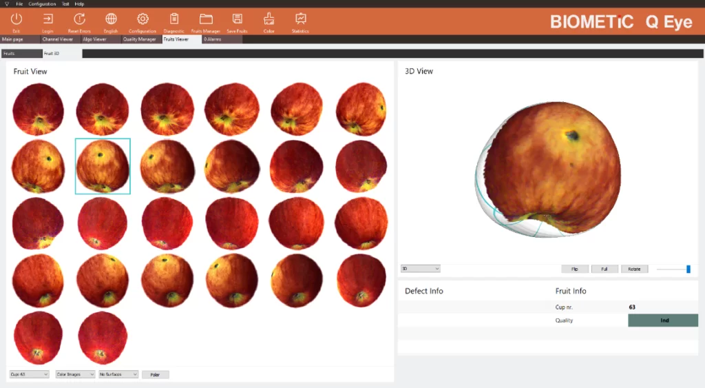 Lo stesso approccio è utilizzato nell’industria alimentare. È il caso di Biometic e della sua tecnologia Q Eye, che analizza frutti, mele nello specifico, in tempo reale, con una precisione estremamente elevata. La sua ricostruzione 3D in linea e la scansione ad alta precisione delle caratteristiche superficiali, del colore, delle dimensioni e del volume dei prodotti assicurano ai confezionatori uno smistamento ottimizzato, suddividendo i frutti sulla base della loro qualità.