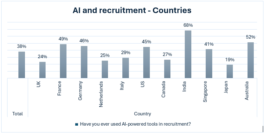 Per colmare il gap tra profili ed esigenze, quasi 1 recruiter su 2 (44%) si appoggia a più strumenti rispetto al passato. In particolare, il 38% degli intervistati dichiara di aver già utilizzato strumenti di intelligenza artificiale per il recruitment. Con il 68% dei responsabili del recruitment ad avere usato l’AI, l’India è in assoluto il Paese che registra la percentuale maggiore. Seguono Australia (52%) e Stati Uniti (45%). In Italia, hanno fatto ricorso all’AI 1 recruiter su 3 (29%).