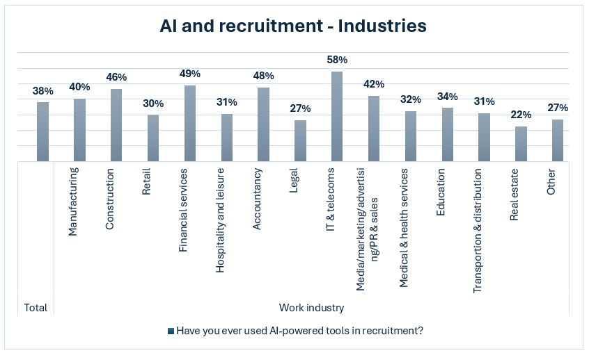 Tra i settori che fanno più ampiamente ricorso a strumenti di recruitment che sfruttano l’intelligenza artificiale spiccano, come prevedibile, i settori dell’IT e telecomunicazioni (58%), dei servizi finanziari (49%) e della contabilità (48%). Si distinguono, tuttavia, con percentuali superiori al 40% anche il settore delle costruzioni (46%) e quello del marketing e delle PR (42%).