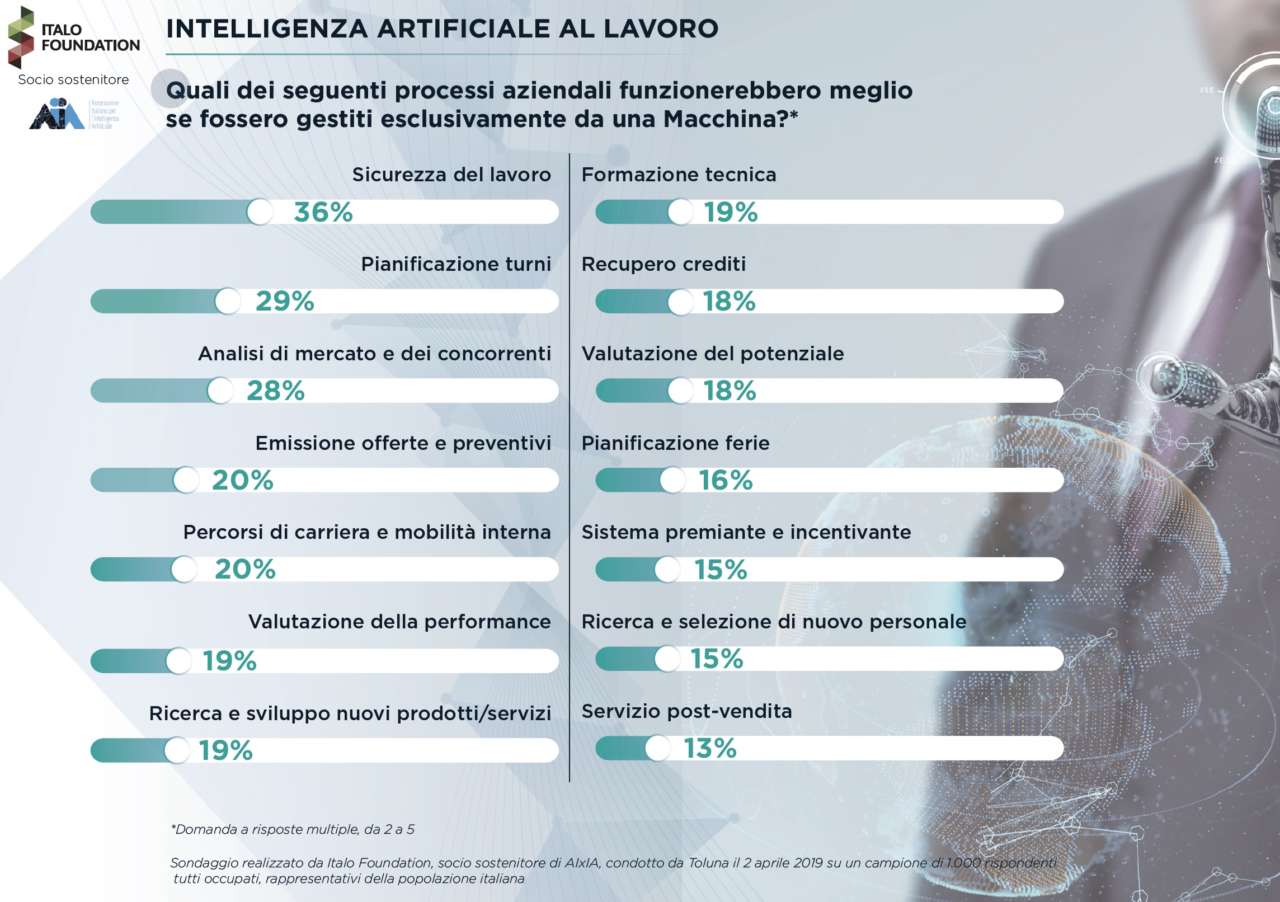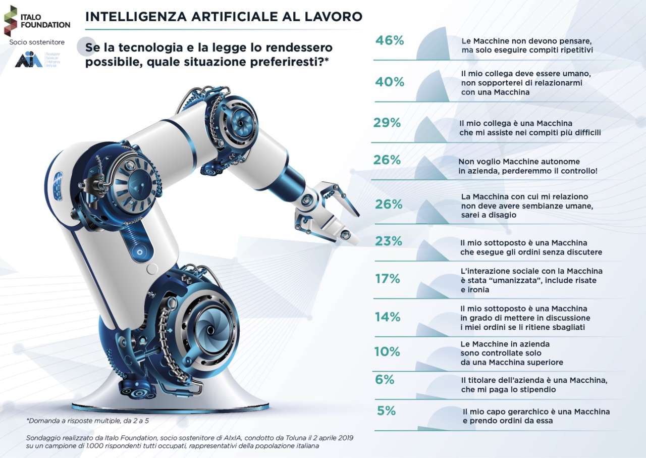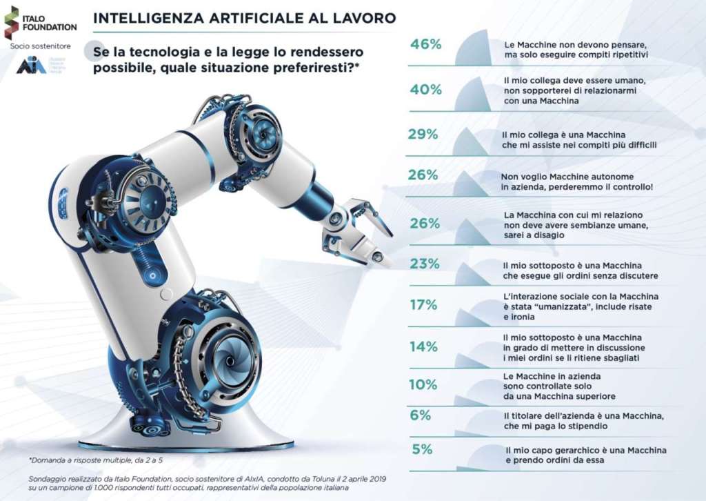 Aall’evento sono stati presentati i risultati della ricerca “Intelligenza artificiale al lavoro” che Italo Foundation ha commissionato a Toluna per analizzare la relazione uomo – macchina nel mondo del lavoro ossia l’impatto dell’introduzione di macchine intelligenti nel processo industriale per le risorse umane.