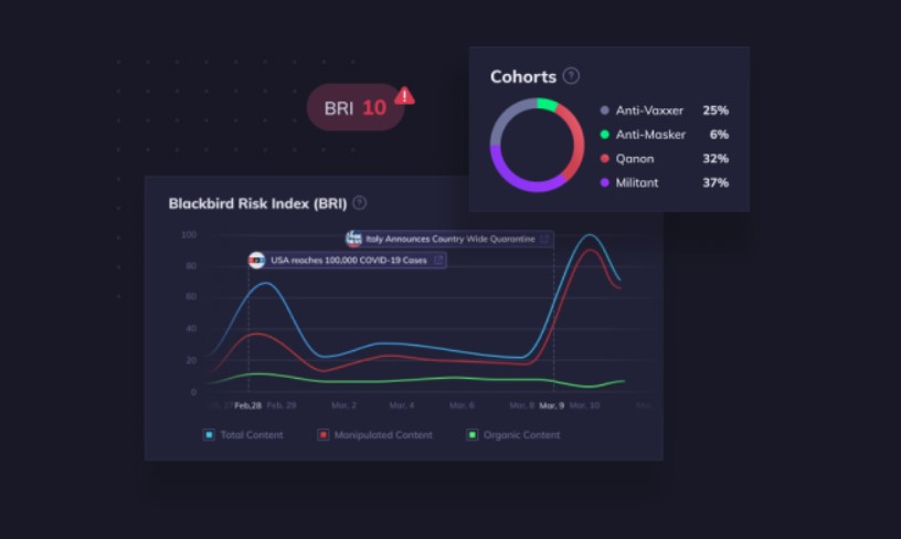 Blackbird è una piattaforma che usa una combinazione tra intelligenza artificiale e machine learning e intelligence umana interdisciplinare, per combattere la disinformazione e proteggere la reputazione di aziende e organizzazioni.