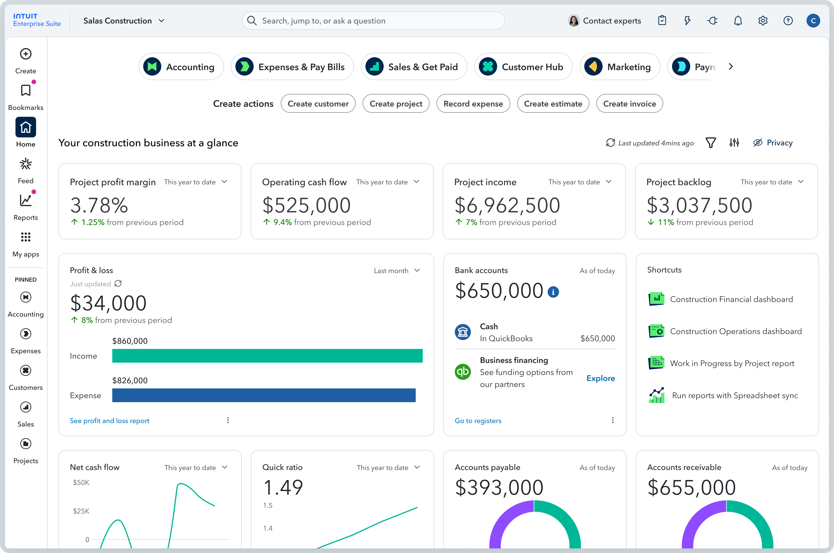 Unlike other ERP systems retrofitted for vertical use, the construction edition for Intuit Enterprise Suite is purpose-built to reflect how construction businesses actually work. Combined with the AI-native capabilities of Intuit Enterprise Suite, it addresses these challenges and meets the needs of construction finance leaders head-on: unifying workflows, automating key processes, and delivering AI-driven insights that help businesses operate with greater speed, accuracy, and control. It also includes all the robust ERP capabilities within Intuit Enterprise Suite required by modern finance teams, including AI-driven insights and multi-entity dashboards.