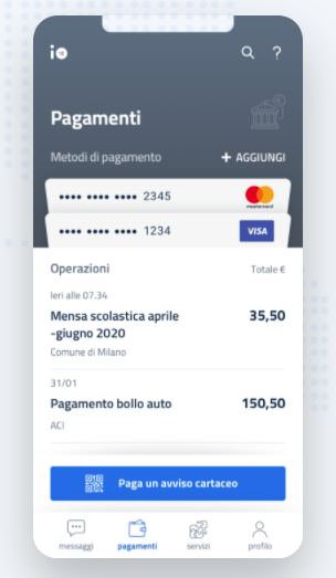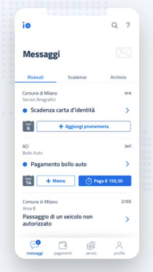 L’app IO presenta messaggi e avvisi da parte della Pubblica Amministrazione, così come aggiornamenti sulle scadenze, comodamente in una singola posizione. Offre poi pagoPA integrata nell’app, per pagare in modo rapido e sicuro i servizi degli enti pubblici e avere lo storico delle operazioni.