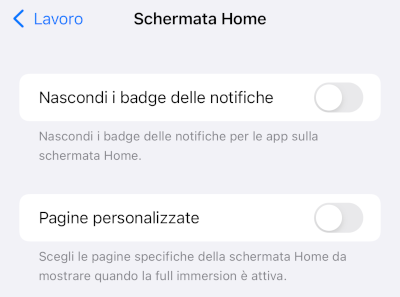 Per la schermata Home, possiamo nascondere i badge delle notifiche e scegliere le pagine da mostrare sul nostro iPhone. In questo caso, iOS ci consentirà di selezionare quali pagine mostrare in modo da – per esempio – visualizzare solo le schermate contenenti determinate app utili all’attività che stiamo svolgendo.