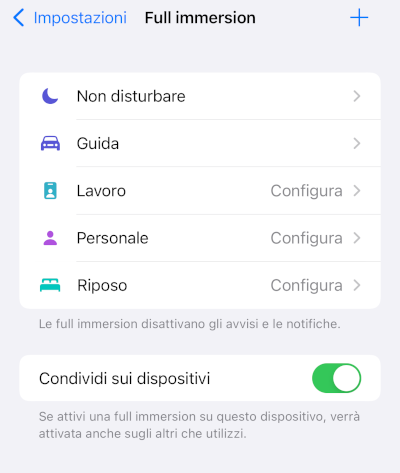 Alla fine della configurazione guidata, iOS visualizza la scheda della Full immersion: da qui possiamo modificare le impostazioni e personalizzare altre opzioni.