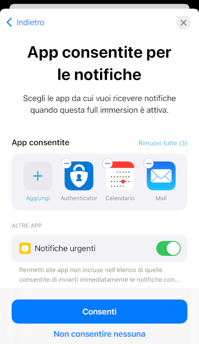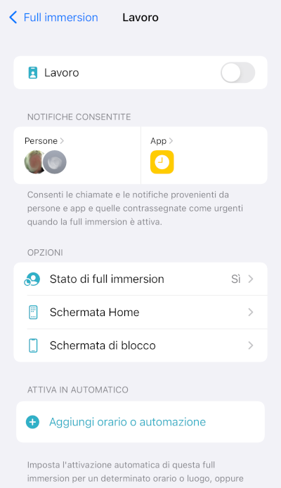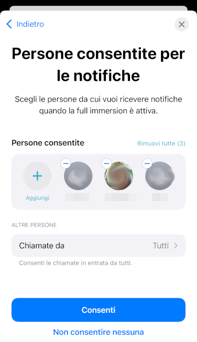 Dalla schermata di configurazione di Full immersion è possibile rivedere e modificare la scelta di persone e app le cui notifiche e chiamate sono consentite.