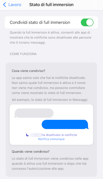 Tra le opzioni, possiamo decidere di condividere lo stato di Full immersion: in tal caso le app mostreranno che le nostre modifiche sono disattivate (nella scheda stessa viene spiegato cosa e quando viene condiviso).