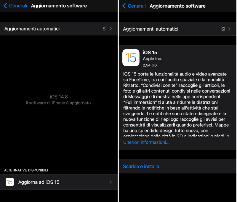 Gli utenti ora possono decidere di rimanere alla precedente major release o aggiornare a iOS 15, che, nella scheda Aggiornamento software delle Impostazioni, viene presentato come alternativa disponibile.