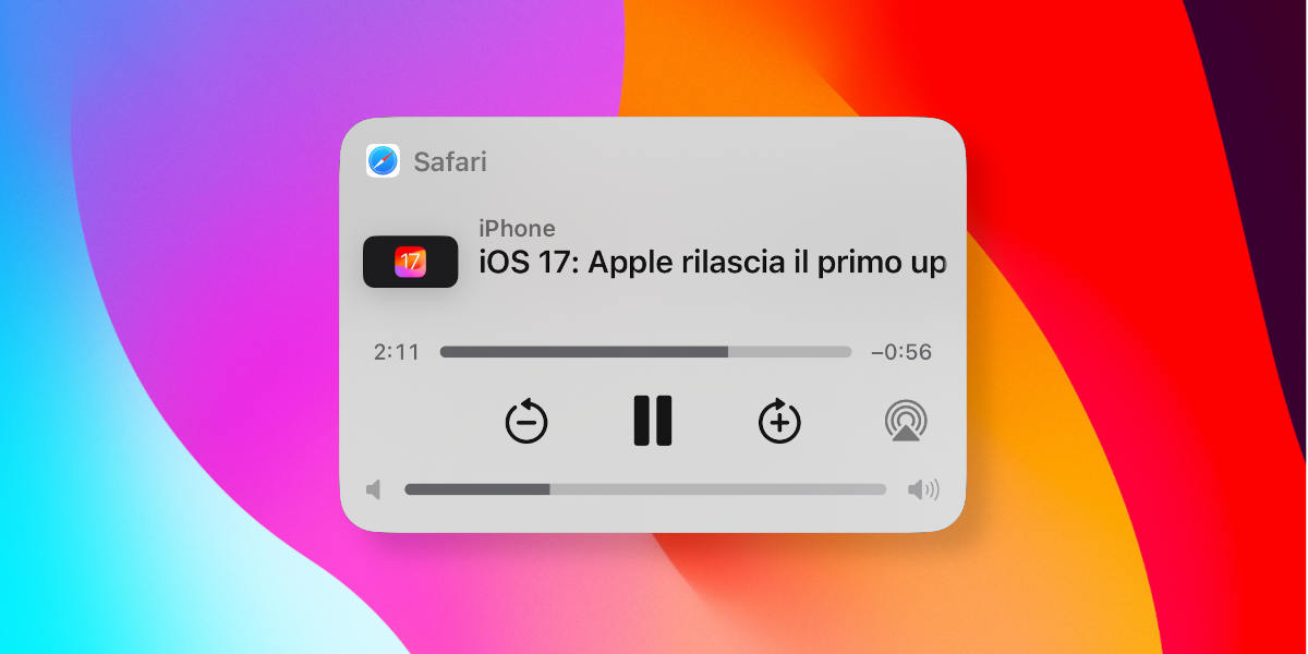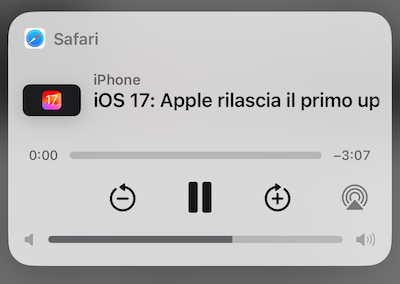 Contestualmente, iOS 17 mostra anche i controlli di riproduzione di Siri, con cui possiamo mettere in pausa e riprendere la riproduzione, andare avanti e indietro veloce, regolare il volume.