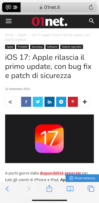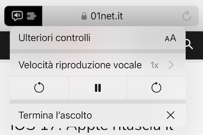 Nella pagina web che Siri sta leggendo, Safari di iOS 17 indica nella barra dell’indirizzo che è in corso la lettura.