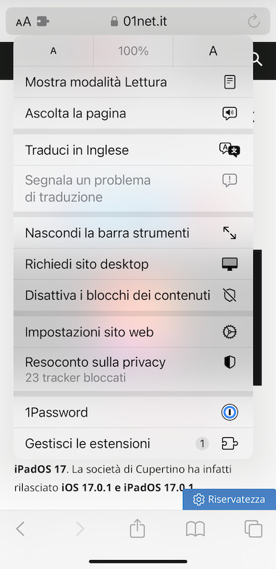 Vediamo allora come fare per ascoltare una pagina web aperta in Safari, su un iPhone che esegue l’ultima versione del sistema operativo, iOS 17.
