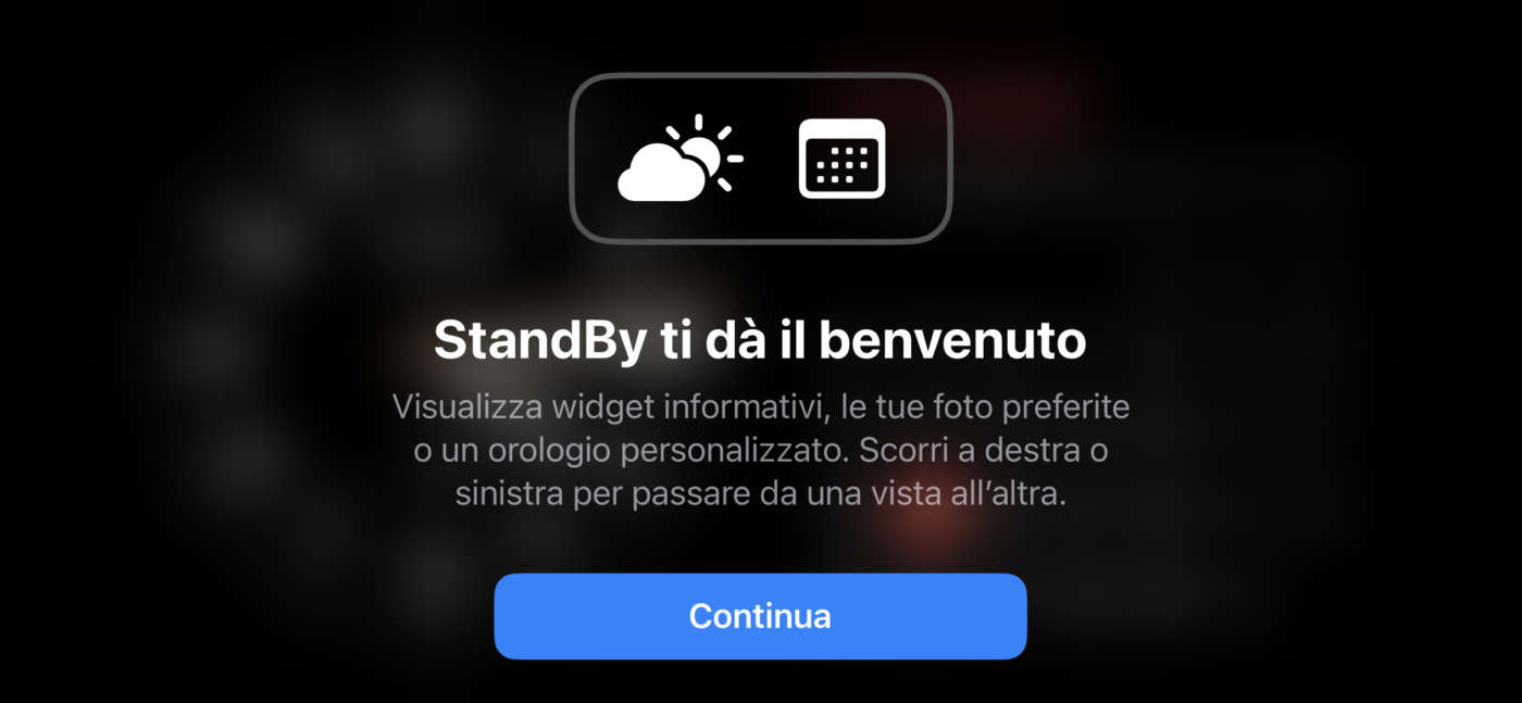 La prima volta che StandBy si attiva, ci accoglie con una schermata di benvenuto: con un tap su Continua si accede alla nuova esperienza full-screen nella sua configurazione predefinita.