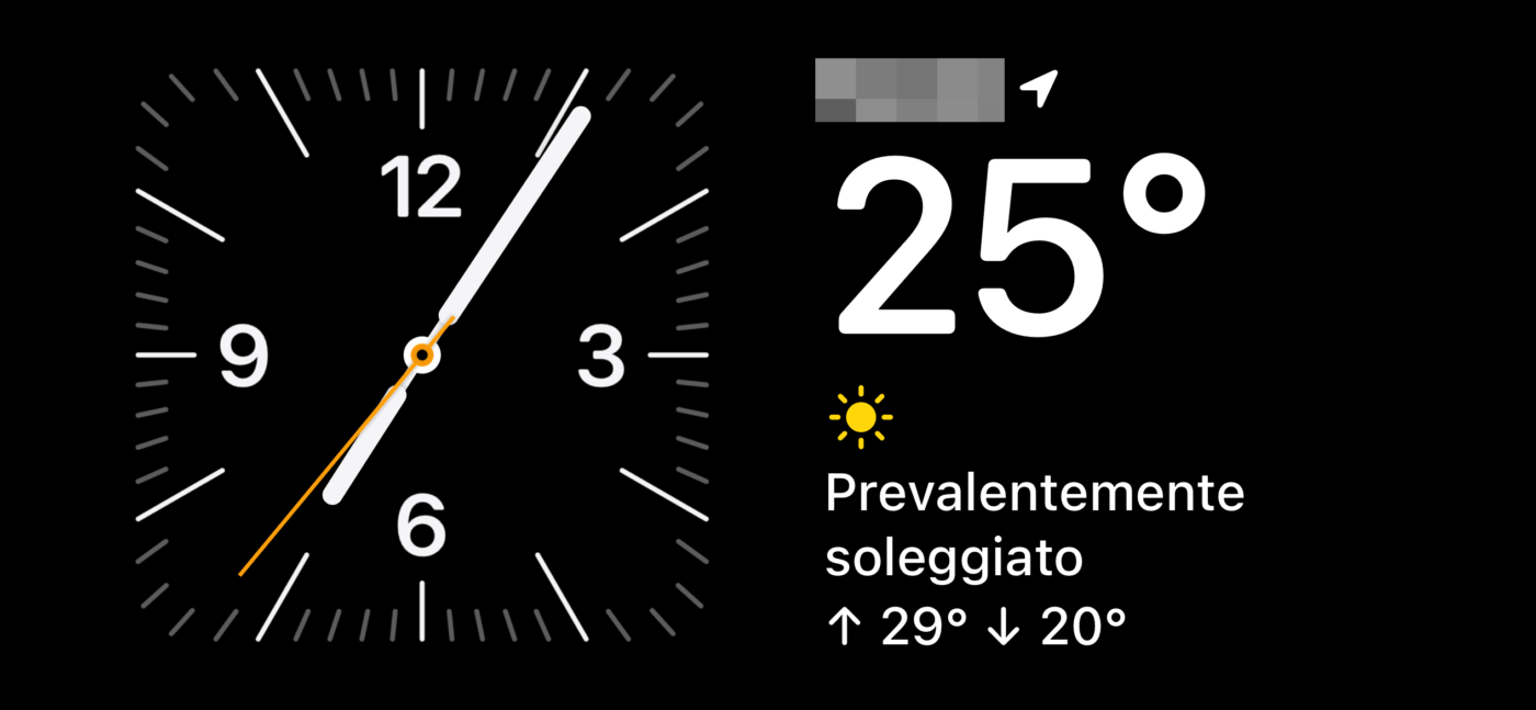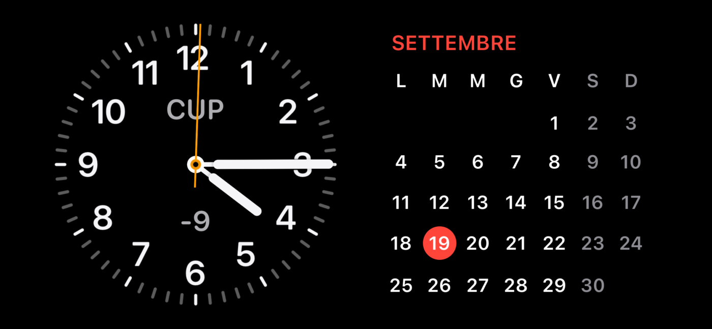 La prima schermata di StandBy è costituita da due widget informativi: di default, orologio e calendario (verificate che non sia mostrata di default l’ora di Cupertino, in California, dove è situata la sede di Apple, per evitare disguidi quando si è sovrappensiero).