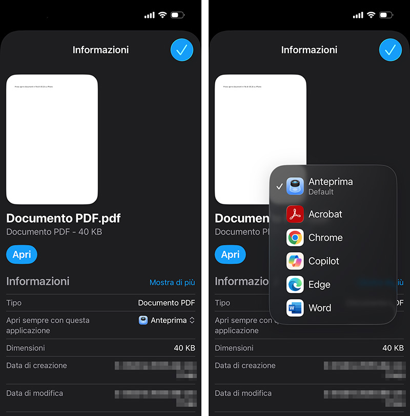 Nel nostro esempio, ci interessa aprire un file PDF: il menu Apri con ci fornisce le opzioni disponibili oltre a quella predefinita. Ad esempio, potremmo voler aprire il PDF con Adobe Acrobat invece che con Anteprima, che è la scelta di default di iOS.