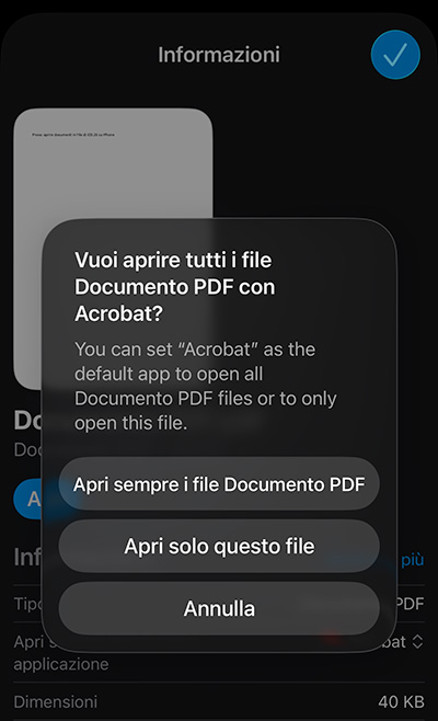O meglio: iOS 26 ci offre un’ulteriore opportunità di personalizzazione. Possiamo scegliere se aprire sempre con l’app selezionata solo quel singolo file, oppure se aprire sempre con l’app selezionata tutti i file di quel determinato tipo. Nel nostro esempio, se aprire sempre con Acrobat solo il file che abbiamo selezionato o aprire sempre con Acrobat tutti i file PDF.