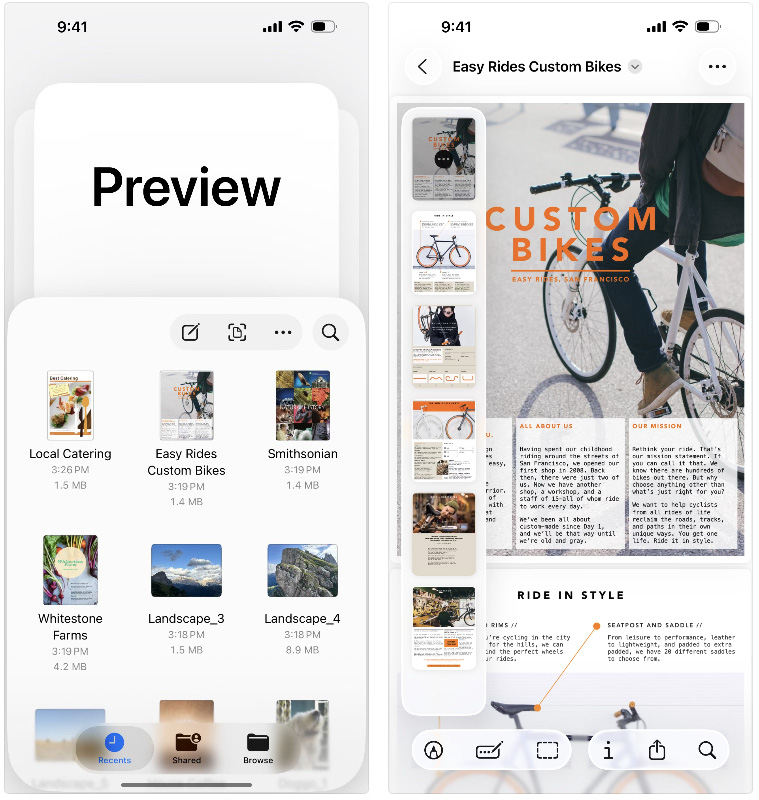 Anteprima semplifica la lettura e il lavoro con i PDF e le immagini. Consente di trovare e accedere facilmente ai PDF e alle immagini salvate nell’app File direttamente da Anteprima, oppure di usare la fotocamera di iPhone per scansionare rapidamente un documento anche di più pagine per poi salvarlo come PDF. E offre strumenti integrati per creare, modificare, annotare, contrassegnare ed esportare i PDF.