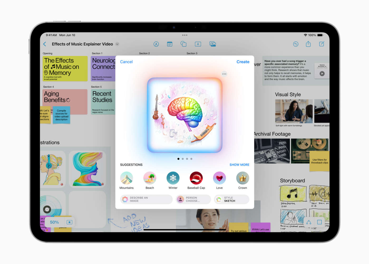 Nuove funzioni creative moltiplicano le opzioni per comunicare ed esprimersi. Con Image Playground, l’utente può creare immagini divertenti in pochi secondi scegliendo fra tre stili diversi: animazione, illustrazione, schizzo. Image Playground è semplice da usare e, oltre a essere integrata in app come Messaggi, è anche disponibile in un’app dedicata. In Note, si può accedere a Image Playground attraverso la nuova Image Wand nella palette di strumenti di Apple Pencil, per rendere le note graficamente più accattivanti.