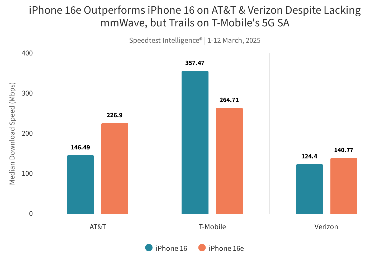 Inoltre, i dati di Speedtest mostrano che l’iPhone 16e ha registrato velocità di download mediane più elevate rispetto all’iPhone 16 su entrambe le reti AT&T e Verizon, ma è stato nettamente più lento sulla rete di T-Mobile.