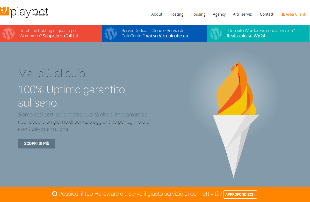 In breve: Playnet Fornisce servizi di Datacenter-Housing, Hosting e Web Design mettendo al servizio del cliente le proprie infrastrutture tecniche di alto livello e un supporto tecnico-sistemistico frutto di una lunga esperienza nel settore. Le sue soluzioni si caratterizzano per essere sviluppate e personalizzate sulle esigenze del cliente: Oltre a soluzioni predefinite, fornisce attività di analisi, consulenza e supporto tecnico per l’attivazione di server virtuali per ospitare applicativi web, gestionali e backup di dati o per la virtualizzazione di server fisici. Per tutti i servizi può fornire, su richiesta del cliente, l’assistenza tecnica e sistemistica (servizio managed). In questo modo il cliente non vede Playnet come solo il suo fornitore di servizi Internet ma piuttosto un partner per la propria crescita aziendale. I datacenter di Playnet sono in Italia, forniscono supporto tecnico telefonico o via ticket anche in orario extra lavorativo. Il reparto sviluppo web di Playnet utilizza i CMS più evoluti e consolidati per realizzare portali ed e-commerce, con la possibilità di integrazione con software ospitati su server esterni (gestionali amministrativi o di magazzino) attraverso l’utilizzo e la scrittura di webapi o codice proprietario.