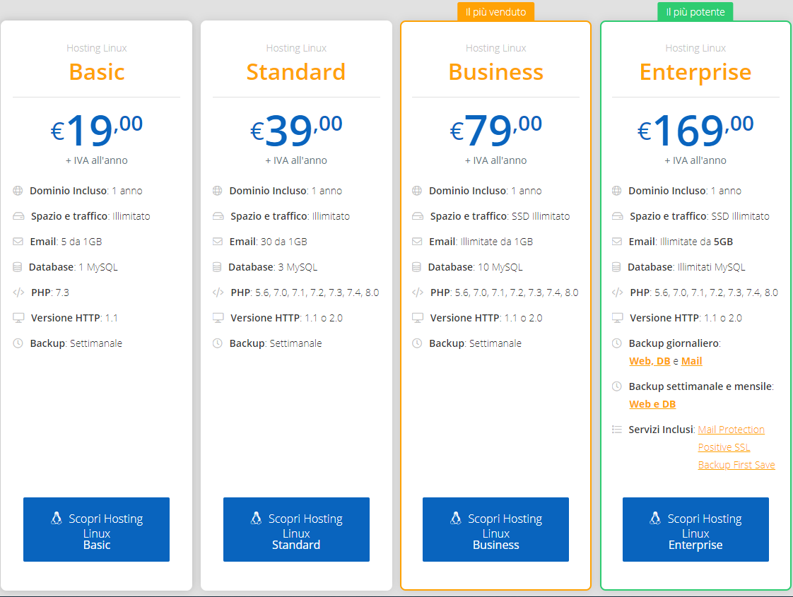 In breve: Per chiunque voglia realizzare un sito web performante ed affidabile, Shellrent provvede alla registrazione di oltre 1.350 estensioni di dominio, abbinate ai piani hosting Linux compatibili con i più comuni applicativi e CMS presenti sul mercato come WordPress, Joomla o PrestaShop. Ogni piano hosting Shellrent include per il primo anno il dominio con l’intenzione di offrire al cliente un servizio pronto all’uso. Tutti i piani includono spazio e traffico illimitato (SSD per il piano Business e Enterprise); backup settimanale di default per garantire protezione; certificato Let’s Encrypt per il protocollo HTTPS, con la possibilità di optare per un certificato emesso da un’autorità di certificazione per una garanzia sul fatturato transato; multiPHP dalla versione 5.6 alla 8.0 (ad esclusione del Basic). Per installare in modo semplice e veloce il CMS, Shellrent offre il servizio di auto-installazione in pochi click. Molto fornita la libreria di servizi aggiuntivi per personalizzare al meglio il servizio hosting con backup giornalieri e mensili aggiuntivi, sia web che posta; possibilità di optare per un IP dedicato; servizi per migliorare il rating di consegna delle e-mail. Shellrent si occupa della gestione dei piani hosting dall’infrastruttura fino ai demoni, lasciando a carico del cliente solo la gestione delle applicazioni per offrire un servizio managed. Non solo hosting Linux, nella sua proposta Shellrent include anche piani hosting Windows e con pannello Plesk.