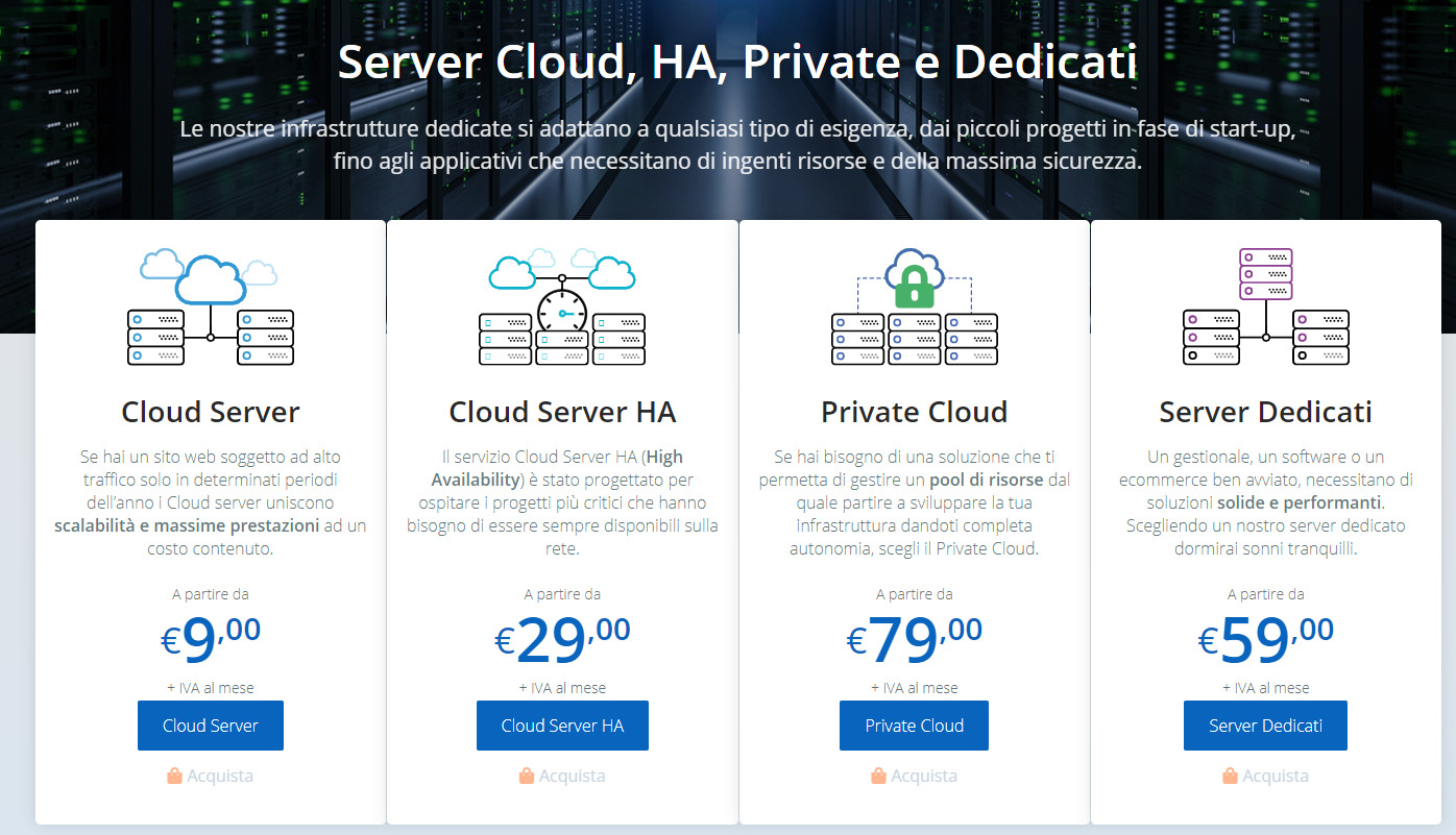 Soluzioni: Cloud Server, Cloud Server HA, Private Cloud e Server Dedicati