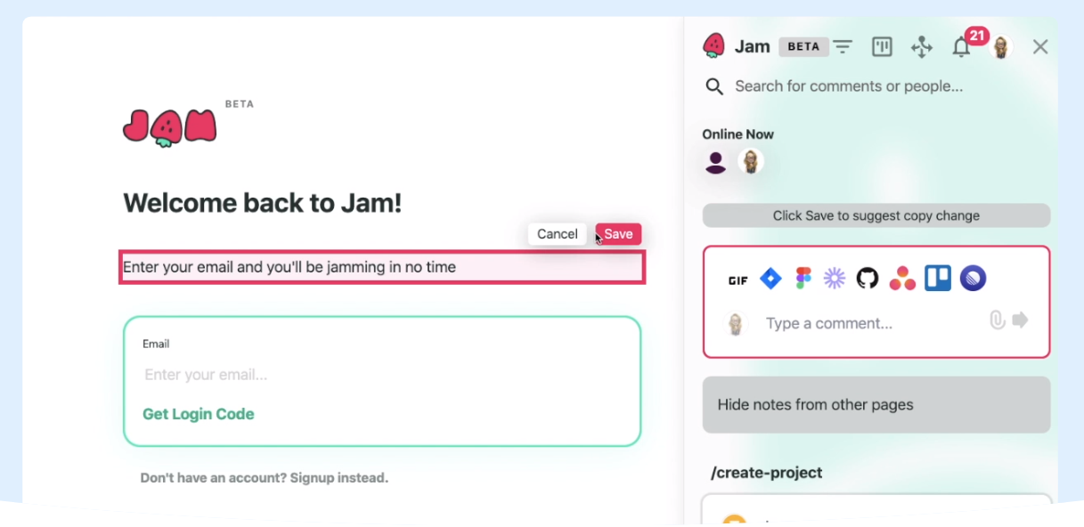 Jam è una piattaforma sviluppata con l’obiettivo di trasformare un qualsiasi prodotto o sito web in un documento collaborativo in cui diventa possibile commentare, discutere, creare task e persino utilizzare strumenti già in uso come Jira e Asana.