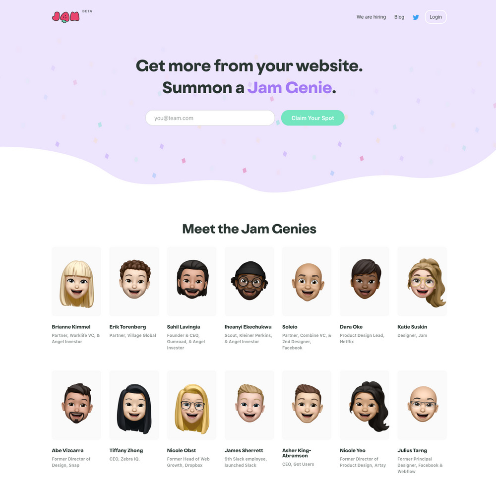 Ancor più di recente, alla fine di gennaio, ha introdotto Jam Genies: una rete di esperti di fama mondiale pronti ad aiutare il proprio team a costruire un sito web migliore. Con questo nuovo lancio, agli strumenti per costruire un prodotto Jam affianca la possibilità per i propri clienti di accedere alla conoscenza e al know how di esperti del settore.