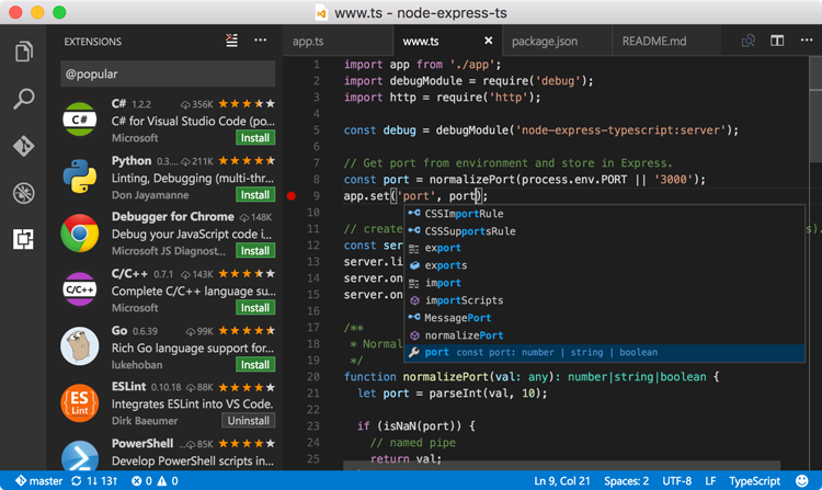 Lo stesso non si può dire per Visual Studio Code, la versione gratuita e molto più “light” dell’IDE ufficiale che è disponibile anche per macOS e Linux. Non ha le funzioni evolute del fratello maggiore ma dal punto di vista di chi sviluppa in JavaScript c’è un po’ di tutto tra le funzioni più utili. Tra queste segnaliamo il supporto integrato a TypeScript, un auto-completamento molto evoluto grazie a IntelliSense e la compatibilità con Node.js e – attraverso plugin – anche con Angular e React.