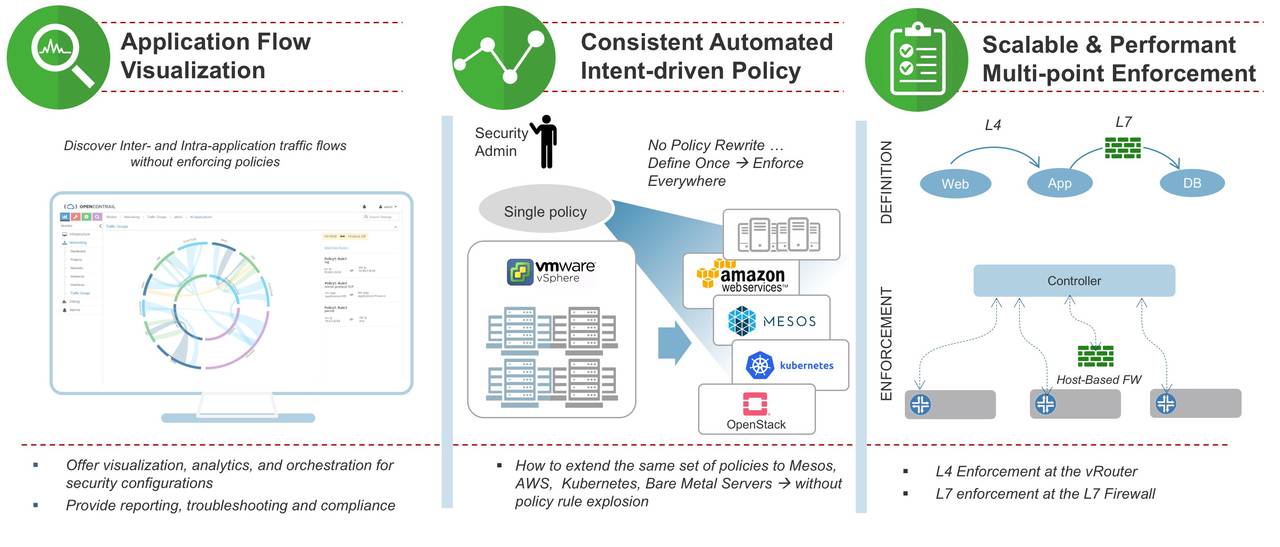 Semplifica la creazione di regole consentendo agli amministratori di raggiungere l’obiettivo utilizzando semplici elementi (spesso anche grafici) che consentono una micro-segmentazione intelligente tra i diversi ambienti cloud, tra cui OpenStack, Kubernetes, cloud pubblici e altro ancora.