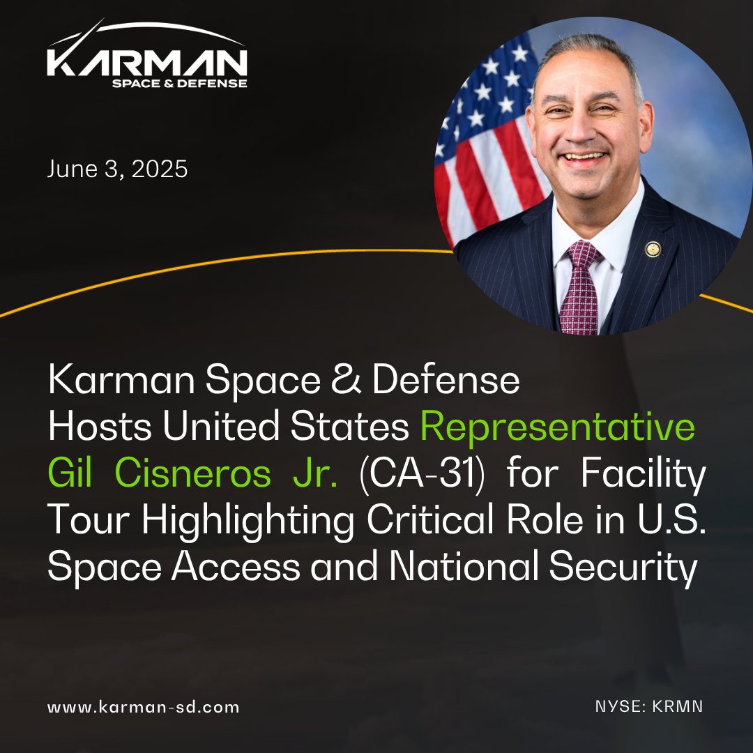 HUNTINGTON BEACH, Calif.--(BUSINESS WIRE)--$KRMN #ImpossibleEndsHere--Karman Space & Defense (“Karman” or “the Company”) (NYSE: KRMN), a leader in the rapid design, development and production of critical, next-generation system solutions for launch vehicle, satellite, spacecraft, missile defense, hypersonic and UAS customers, was honored to host Representative Gil Cisneros Jr. representing California’s 31st District for a tour of its South El Monte, CA design and manufacturing facility. The visit highlighted Karman’s decades of experience supporting national security and space missions, along with its dedication to building a highly skilled workforce across multiple facilities in the United States.