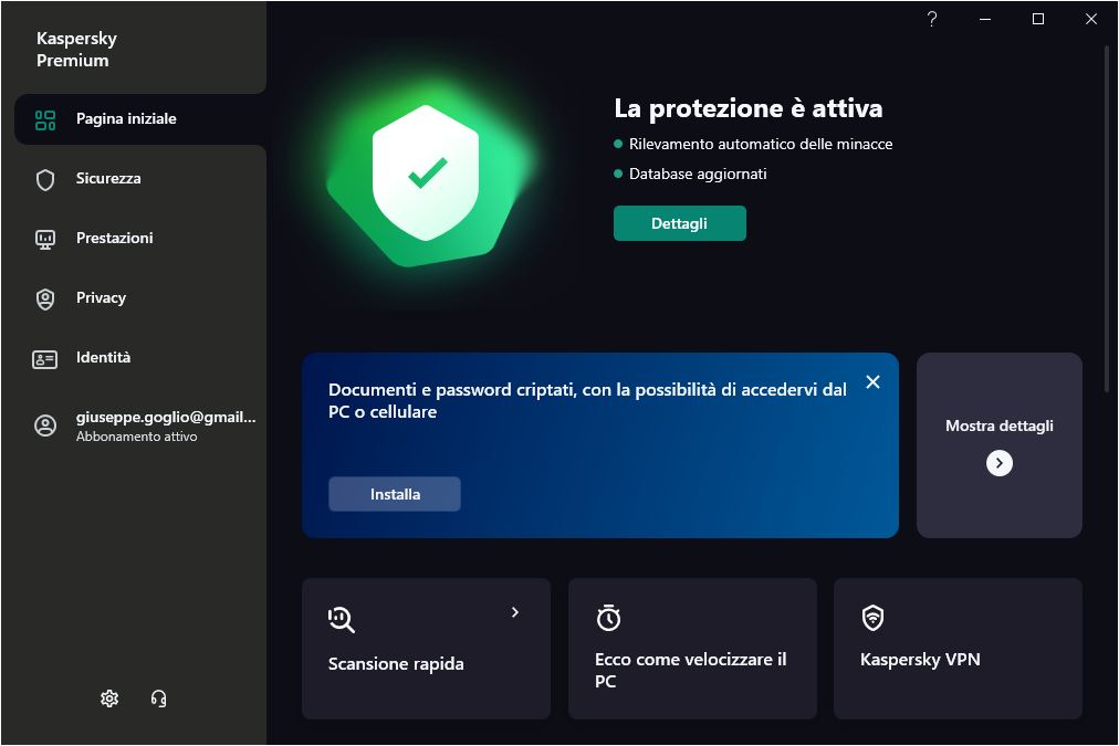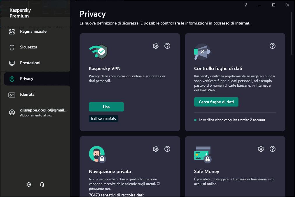 In pratica, Kaspersky Plus si limita ad aggiungere la VPN illimitata. Come già accennato opzione sempre utile, talvolta indispensabile, ma anche esigente dal punto di vista delle risorse computazionali. Quindi, non sempre fruibile. Un’opzione da attivare separatamente.