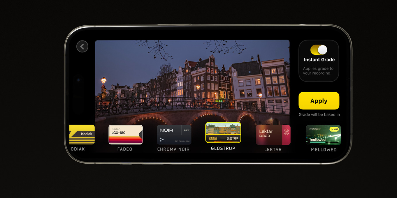 Instant Grade è una delle funzionalità principali di Kino: per svilupparla, Lux ha collaborato con esperti del settore e ha creato una serie di preset di alta qualità, spiega l’azienda. Per l’utente, è possibile applicare uno di questi preset di qualità direttamente al video con un semplice tocco. Il “grade”, il preset di colore, viene applicato al video finale registrato, quindi non sono necessarie modifiche.
