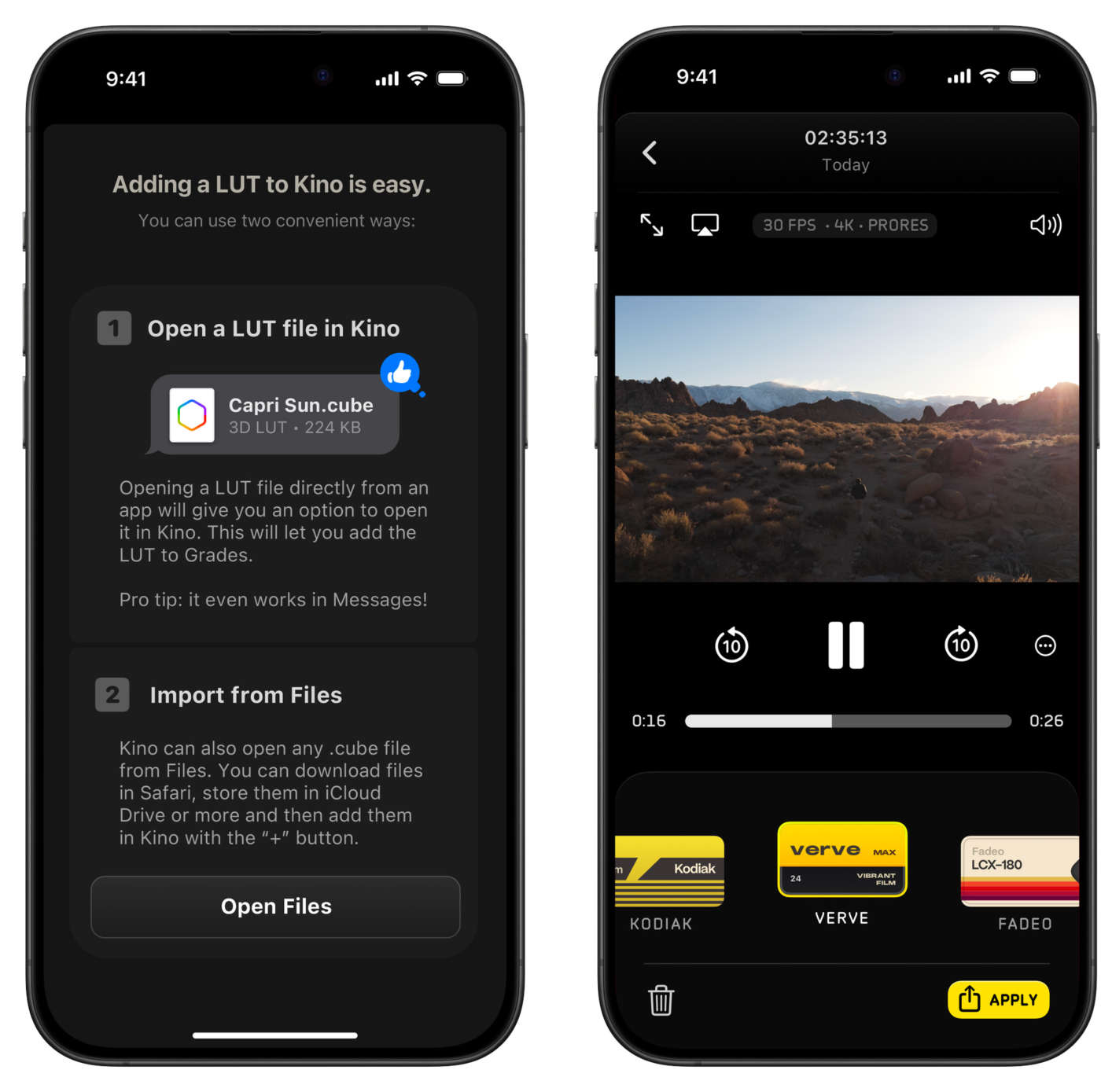 C’è un set esclusivo per Apple Log, ma c’è anche un set per i normali filmati dell’iPhone, in modo che tutti abbiano a disposizione dei preset di qualità. L’app Kino mostra solo i preset compatibili con il formato video con cui l’utente sta registrando o rivedendo.