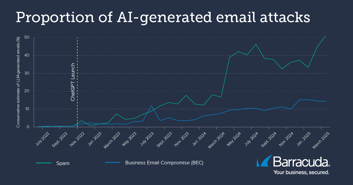Ulteriori informazioni sono disponibili nel blog Half the spam in your inbox is generated by AI – its use in advanced attacks is at an earlier stage di Barracuda.