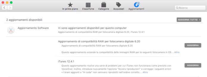 Aggiornare regolarmente tutto OS X comporta anche l’aggiornamento del software per le stampanti, nella maggior parte dei casi. Gli aggiornamenti specifici sono indicati dall’applicazione Mac App Store nella sezione Aggiornamenti. In alternativa lo si può anche cercare e scaricare dal sito di supporto Apple. Attenzione: in questo modo si aggiorna il software di Apple per la stampa, non quello che offre il produttore della stampante.