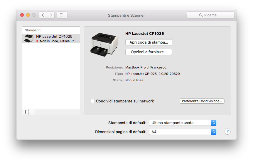 Se la stampante non stampa più le buone maniere non hanno funzionato, una strada da seguire è eliminare la stampante e ripristinarla dalle Preferenze di Sistema. Nella sezione Stampanti e Scanner sono elencate le stampanti configurate, selezioniamo quella che fa le bizze e premiamo il pulsantino con il segno meno (–) nella parte bassa della barra laterale sinistra.