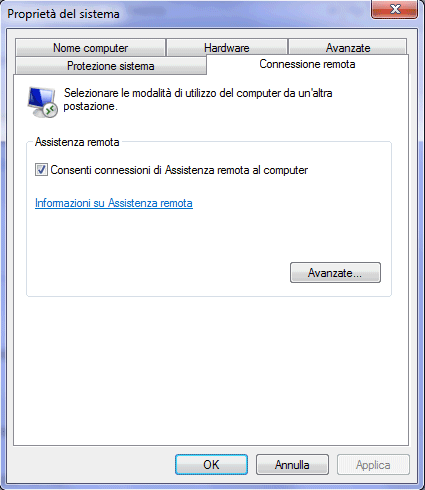 Per utilizzare la funzionalità di Assistenza remota questa deve essere attivata nella finestra Sistema, Connessione remota (in Windows XP) o Sistema, Impostazioni di connessione remota (Windows Vista e Windows 7), presente nel Pannello di controllo di Windows.