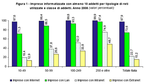 La ricerca Istat segnala come la diffusione dei portali Internet aziendali abbia raggiunto numeri importanti: a gennaio 2008, il 60,5% delle aziende informatizzate aveva un sito web. In particolare, oltre la metà delle imprese con meno di 50 addetti sono presenti su Internet con una pagina web; la percentuale sale all’80,3% per quelle con un numero di addetti compreso fra 50 e 99 e i valori sono ancora più elevati per quelle appartenenti alle fasce dimensionali superiori. Le ditte del Nord presenti nel web sono circa il 65%, mentre quelle del Sud e delle isole sono il 49,9%