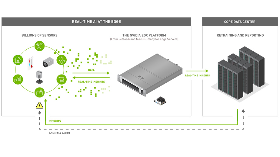 Nvidia EGX è una piattaforma scalabile progettata per portare le capacità di computing d’intelligenza artificiale sull’edge: parte dal modulo compatto Jetson Nano e scala fino ai rack di server T4. È supportata da uno stack software completo, con librerie CUDA-X, container, Kubernetes e soluzioni cloud come Azure IoT.