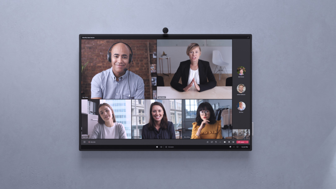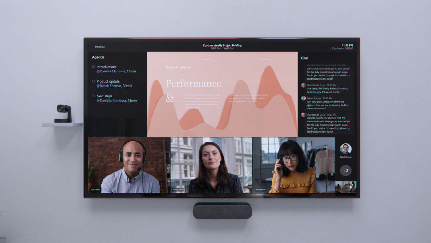 Microsoft ha spostato la video gallery nella parte inferiore dello schermo in modo che i partecipanti remoti siano faccia a faccia con quelli in-room. E per aiutare tutti a rimanere coinvolti, il contenuto della riunione è circondato da informazioni contestuali come l’ordine del giorno, le attività e le note.
