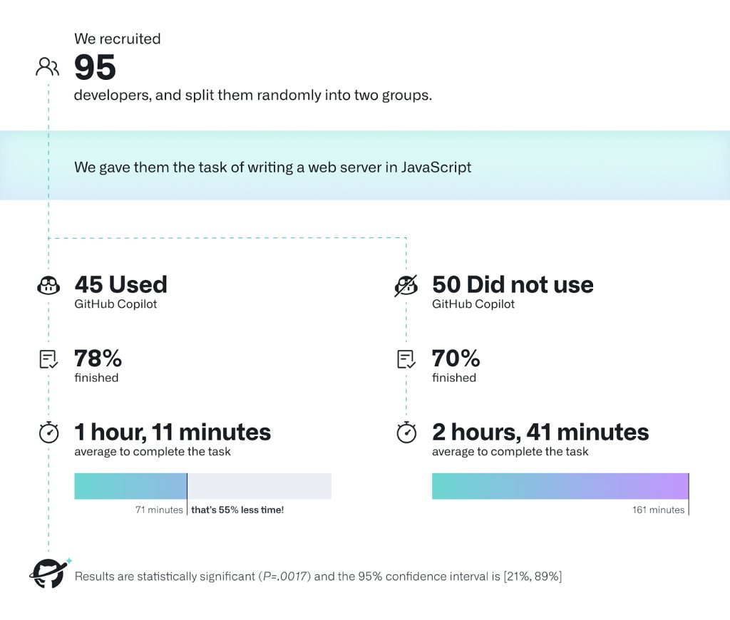 Il gruppo che ha ricevuto accesso a Copilot ha completato il lavoro molto più velocemente: il 55,8 % più velocemente, per essere precisi. Quindi abbiamo un secondo dato. Anche questo va considerato di parte che viene dai ricercatori di Microsoft e Microsoft ha investito cifre colossali in GitHub e OpenAI.