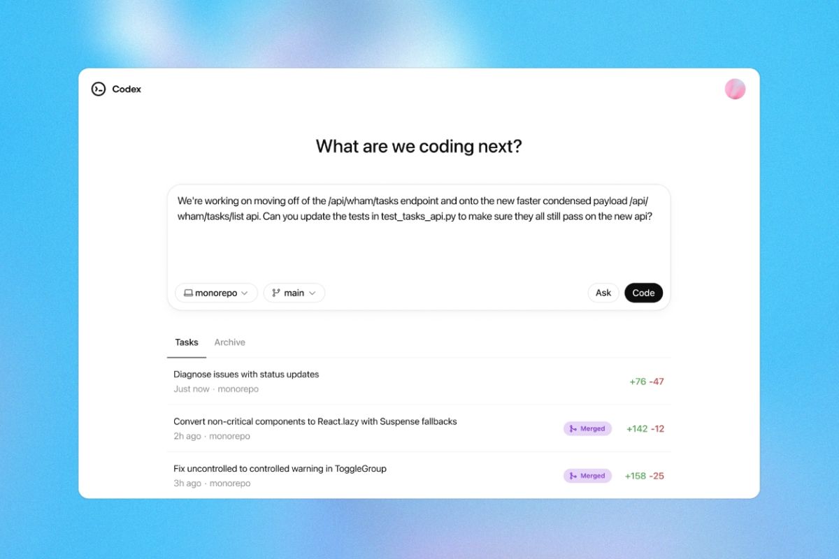 In questa immagine vediamo l’interfaccia semplice e potente di Codex che permette agli sviluppatori di collaborare con un assistente virtuale capace di scrivere codice in modo autonomo.