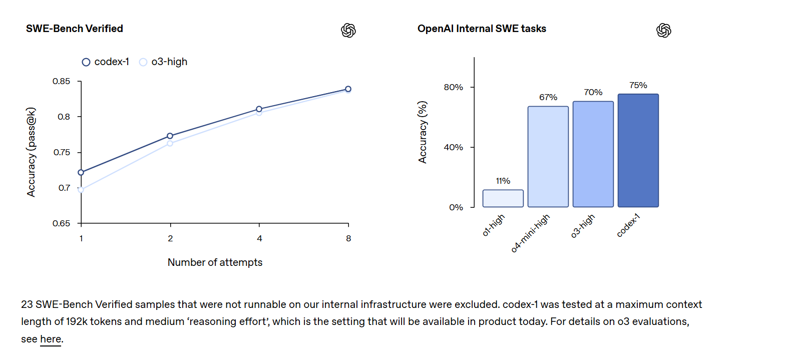 A sinistra, il grafico mostra i risultati del benchmark SWE-bench Verified dove codex-1 ottiene un’accuratezza maggiore rispetto al modello precedente, o3-high, in tutti i tentativi, raggiungendo circa l’83% al quarto.