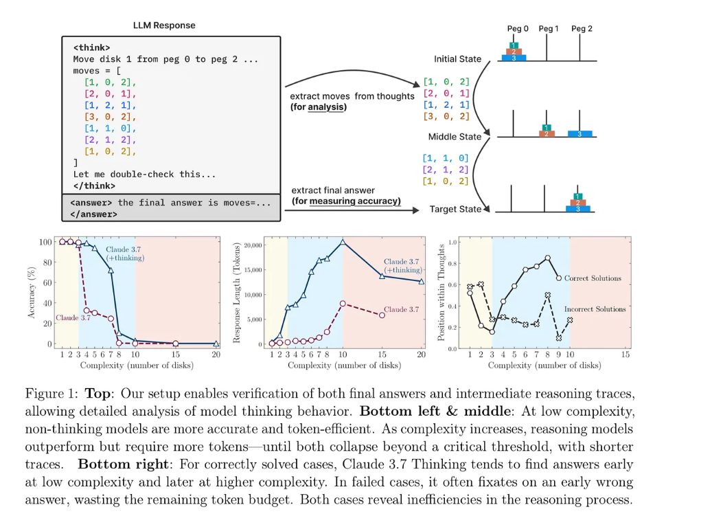 In questa immagine vediamo uno degli esperimenti centrali del paper, basato sul classico problema delle Torri di Hanoi, un compito noto in informatica per testare le capacità di pianificazione e ragionamento sequenziale.