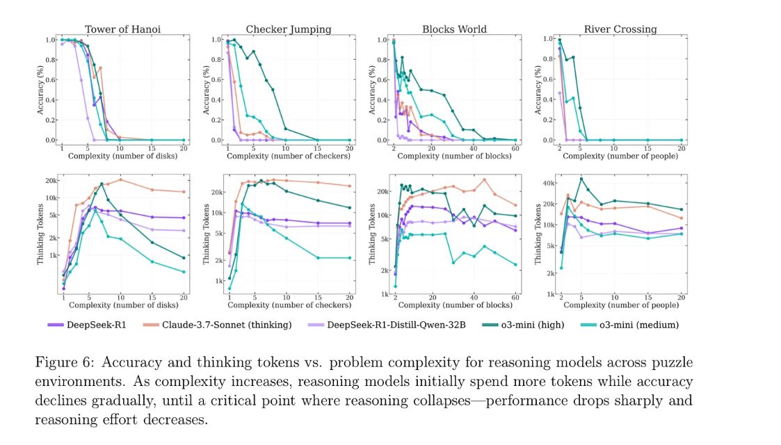 I tre grafici in basso invece sintetizzano i risultati a sinistra vediamo che a bassa complessità, quindi da 1 a 4 dischi anche il modello senza fase di ragionamento Claude 3.7 ottiene ottime performance, ma quando la complessità aumenta, l’accuratezza crolla rapidamente, anche per la versione di Thinking, di ragionamento più avanzata.