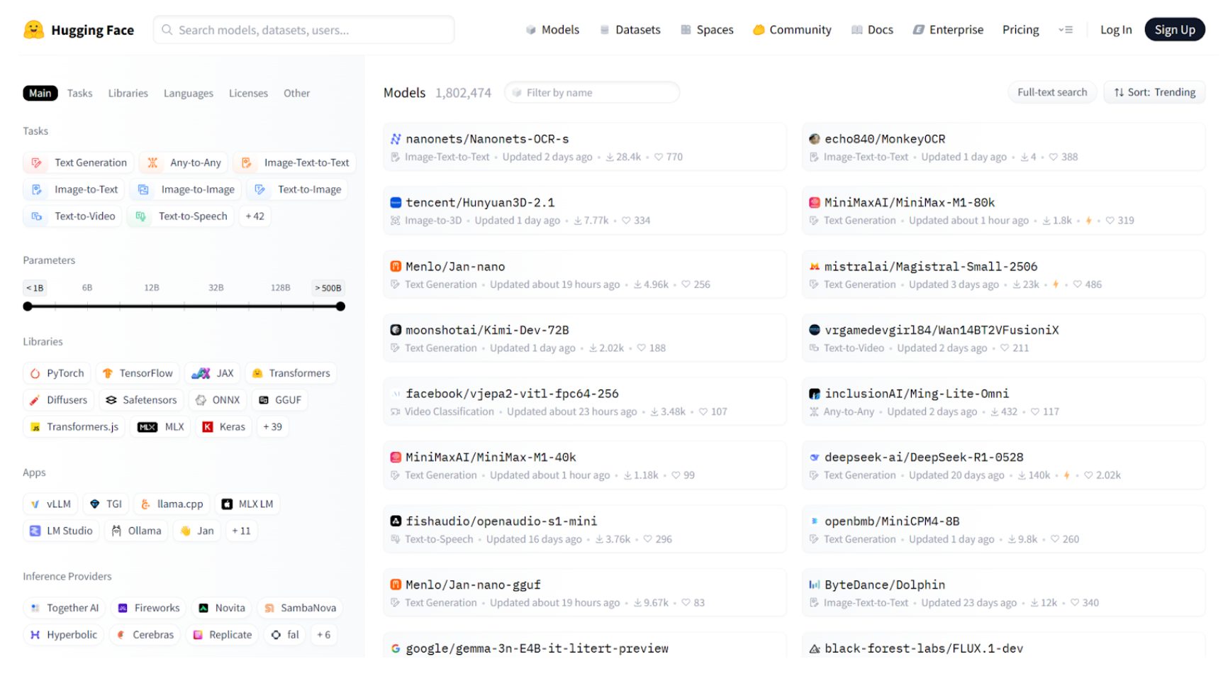 Pensate: oltre 1,8 milioni di modelli, supporto multimodale e un’interfaccia avanzata con filtri per task, librerie, parametri e inferenza, lo vedremo dopo, divenendo di fatto lo standard de facto per soluzioni di natural language processing e molto altro.