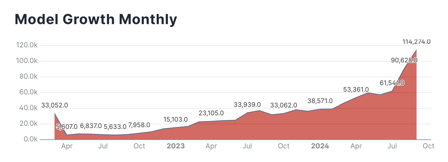 Il picco massimo viene poi raggiunto a settembre 2024, in questo grafico con 115.000 modelli pubblicati in un solo mese, mostrando quindi questa accelerazione incredibile verticale del contributo della community.