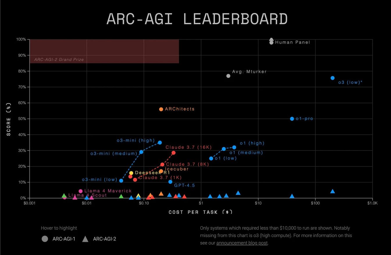 In questa immagine invece vediamo i risultati del benchmark ARC-AGI, un test progettato per valutare la capacità di ragionamento astratto e generalizzazione dei modelli di AI attraverso compiti complessi ispirati all’intelligenza umana come analogie visuo-spaziali e trasformazioni logiche.